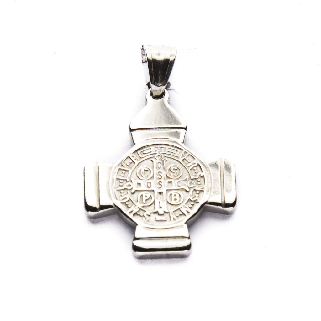Dije Cruz D&K San Benito de Acero Quirúrgico 316L. Alt: 4 cm incl. Argolla. / 500RE-23